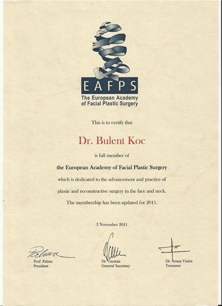 -Certification of The European Academy of Facial Plastic Surgery Full Membership.