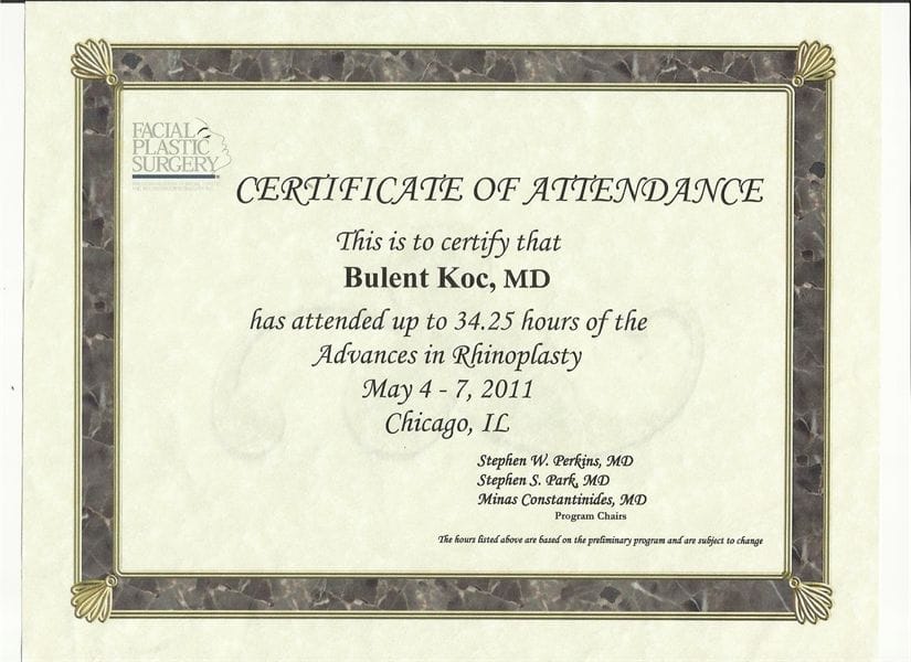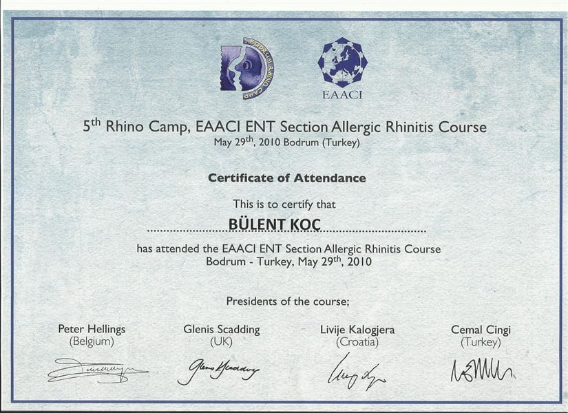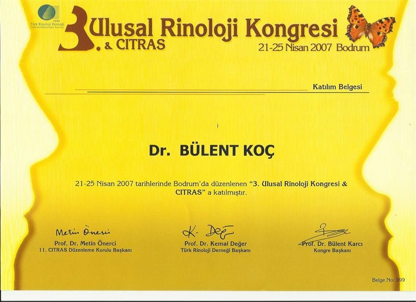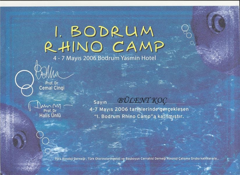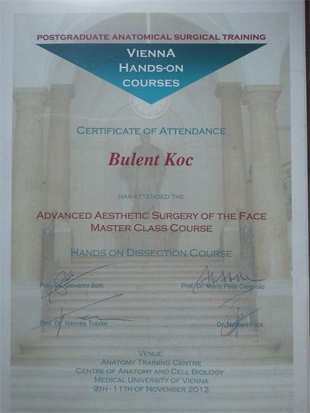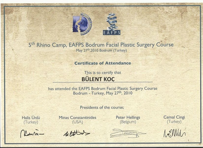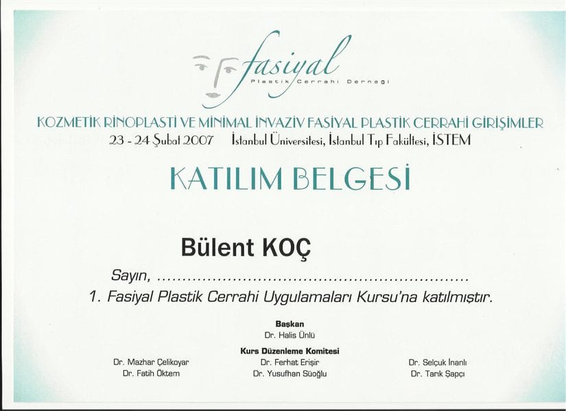 -Fasiyal Plastic Cerrahi Derneği, Kozmetik Rinoplasti ve minimal invaziv Fasiyal Plastic Cerrahi Girişimleri kursu sertifikası 2007/ Türkiye