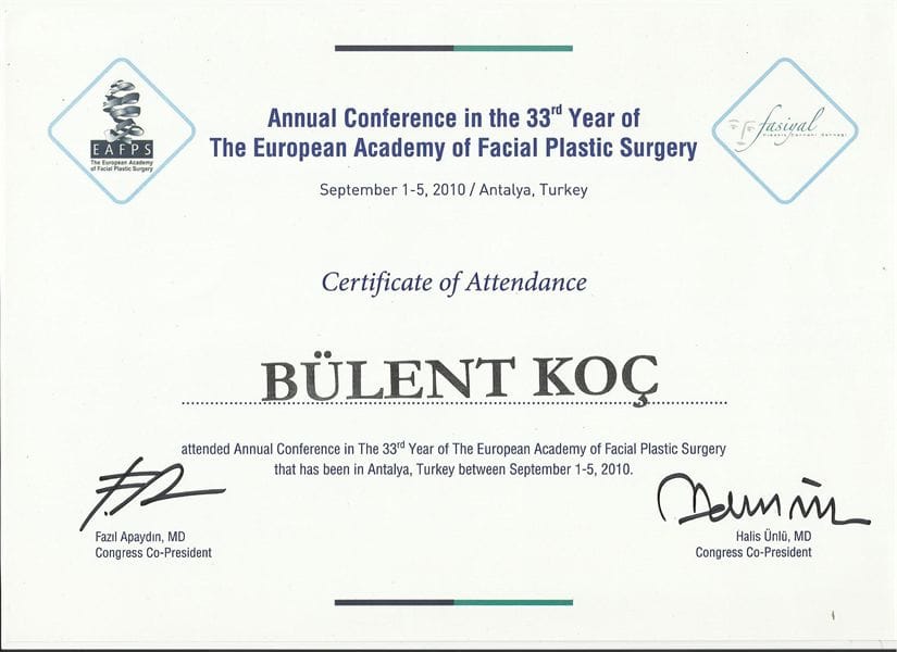 -Annual Conference in the 33rd Year of The European Academy of Facial Plastic Surgery , kongresi ve sertifikası 2010
